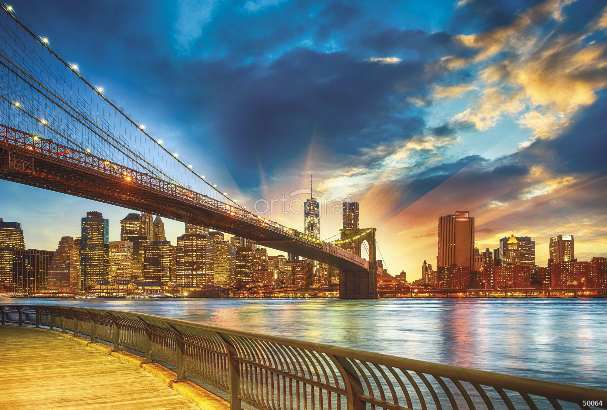 Вид на городской мост через реку и панораму современного мегаполиса на закате, когда огни зданий начинают загораться, создавая атмосферу динамики и величия. Пространство на переднем плане с набережной и ограждением приглашает к прогулкам и любованию пейзажем. Такой сюжет отлично подойдет для интерьеров, где нужно создать ощущение ритма большого города и вдохновляющую атмосферу.