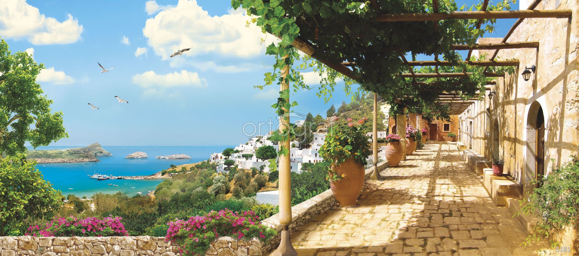 Солнечный пейзаж с видом на морскую бухту, старинные каменные стены, терракотовые горшки с цветами и виноградная беседка создают атмосферу средиземноморского уюта. Такой сюжет отлично подойдет для интерьера, где важно подчеркнуть тепло, гармонию и спокойствие. Рекомендуется использовать в пространствах для отдыха и приема гостей.