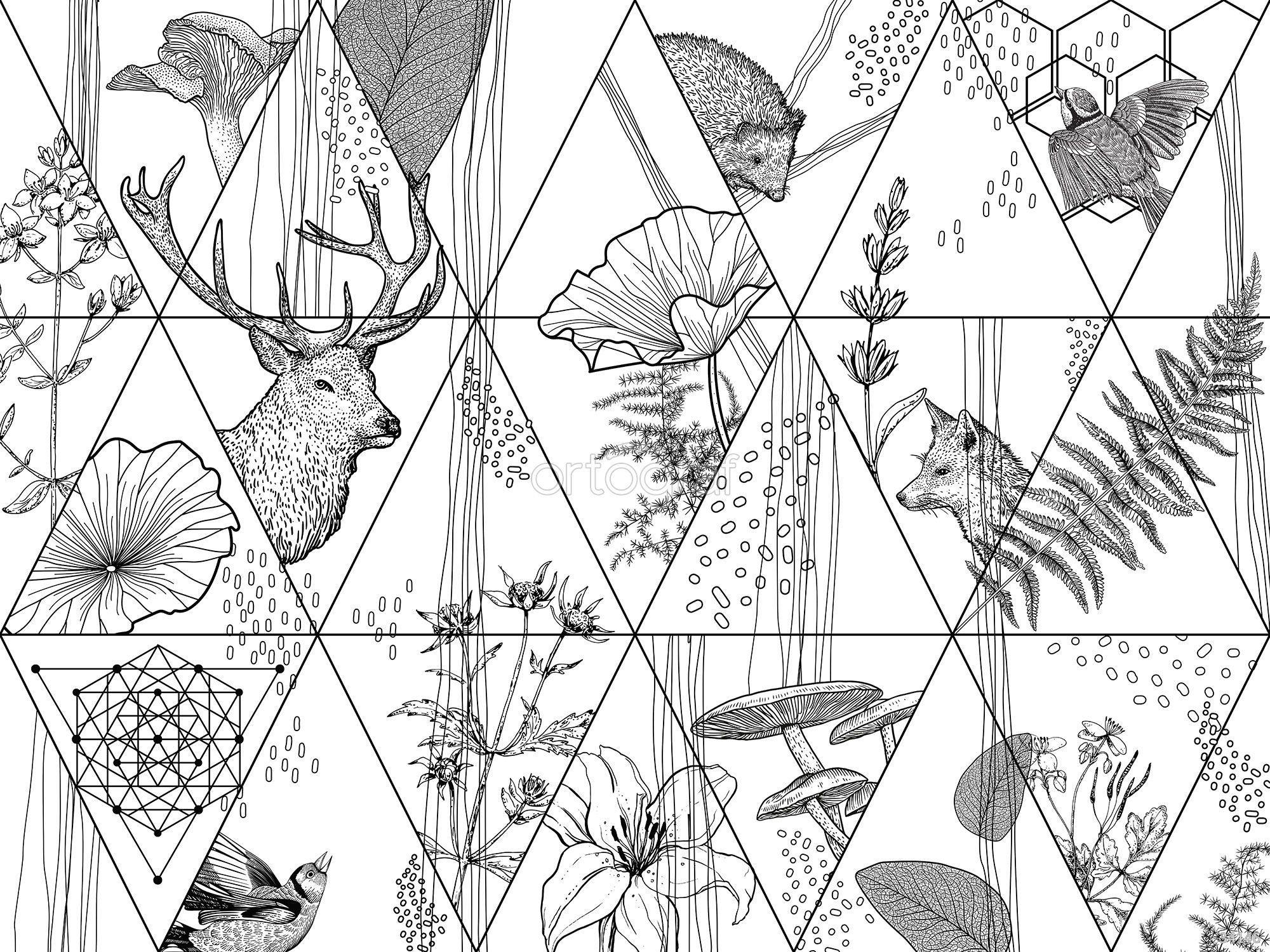 Графичный сюжет с изображением животных, растений и геометрических фигур в обрамлении треугольников идеально подойдёт для современных интерьеров. Такая композиция сочетает мотивы природы и лаконичную структуру, придавая помещению стиль и оригинальность. Подходит для оформления офиса, гостиной, прихожей и коридора, а также спальни.