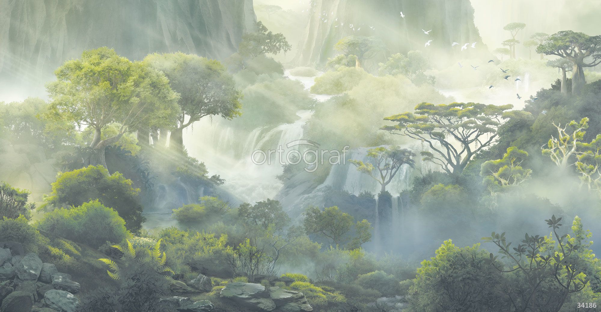 Сюжет с густым лесом, водопадами и струящимся утренним туманом создает эффект глубины, свежести и уединения. Такой рисунок привносит ощущение природы и спокойствия, отлично смотрится в просторных светлых помещениях и наполняет атмосферу гармонией. Подойдет для зон отдыха и поддержания расслабляющего настроения.