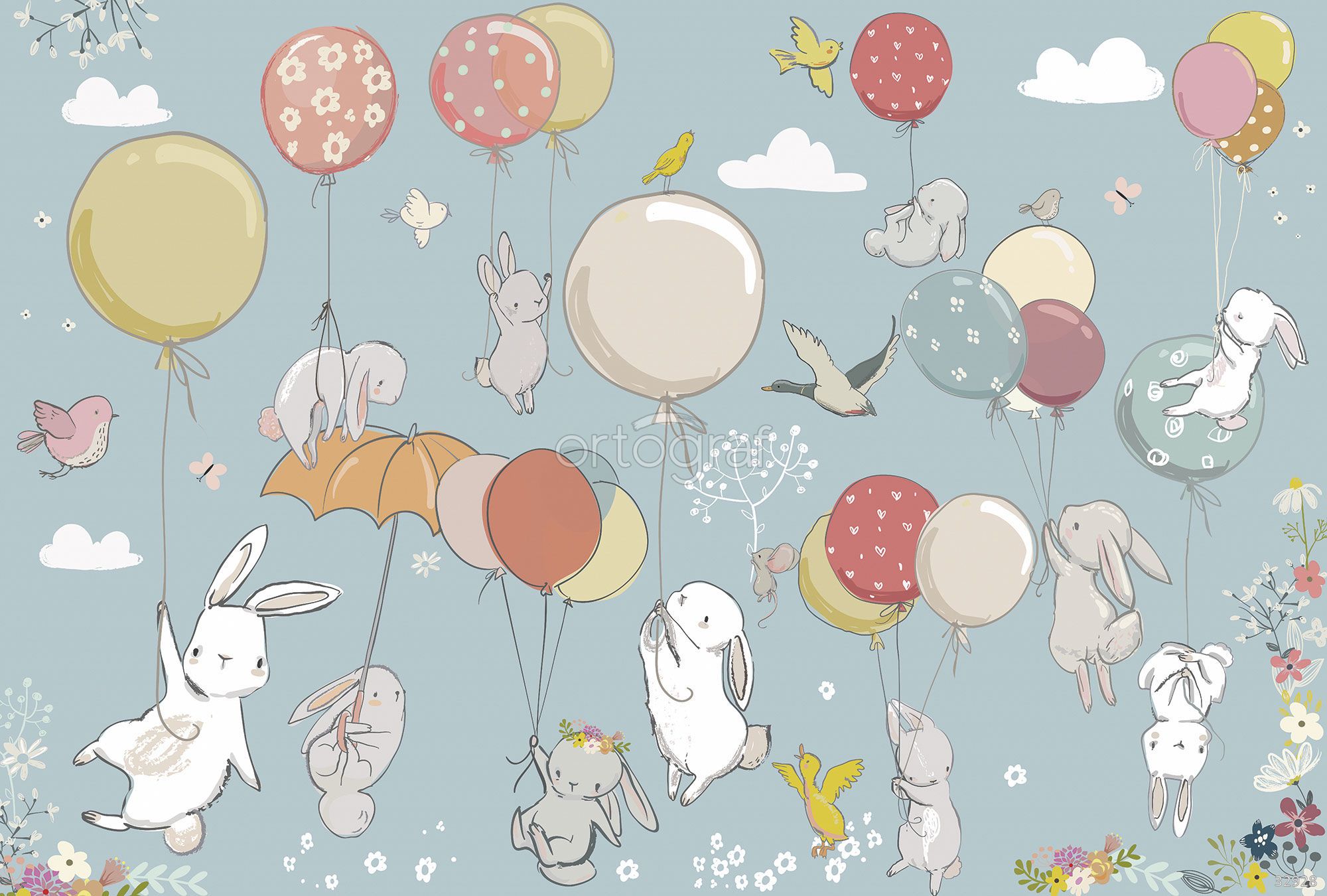 На изображении изображены кролики, которые летают на воздушных шарах и зонтиках среди облаков, птиц и цветов. Иллюстрация передаёт атмосферу легкости и радости, создавая сказочное настроение, идеально подходящее для детских комнат. Такой сюжет способствует развитию воображения и дарит ощущение уюта и беззаботности.