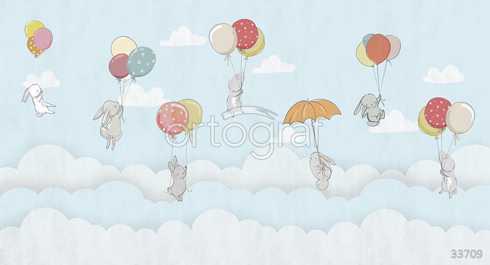 Зайчики, летающие среди облаков с воздушными шариками и зонтиками, придают помещению сказочный и воздушный характер. Такой сюжет создает атмосферу легкости, уюта и способствует развитию воображения, что делает его идеальным выбором для детской комнаты. Украшение будет радовать малышей, создавая пространство для игр и мечтаний.