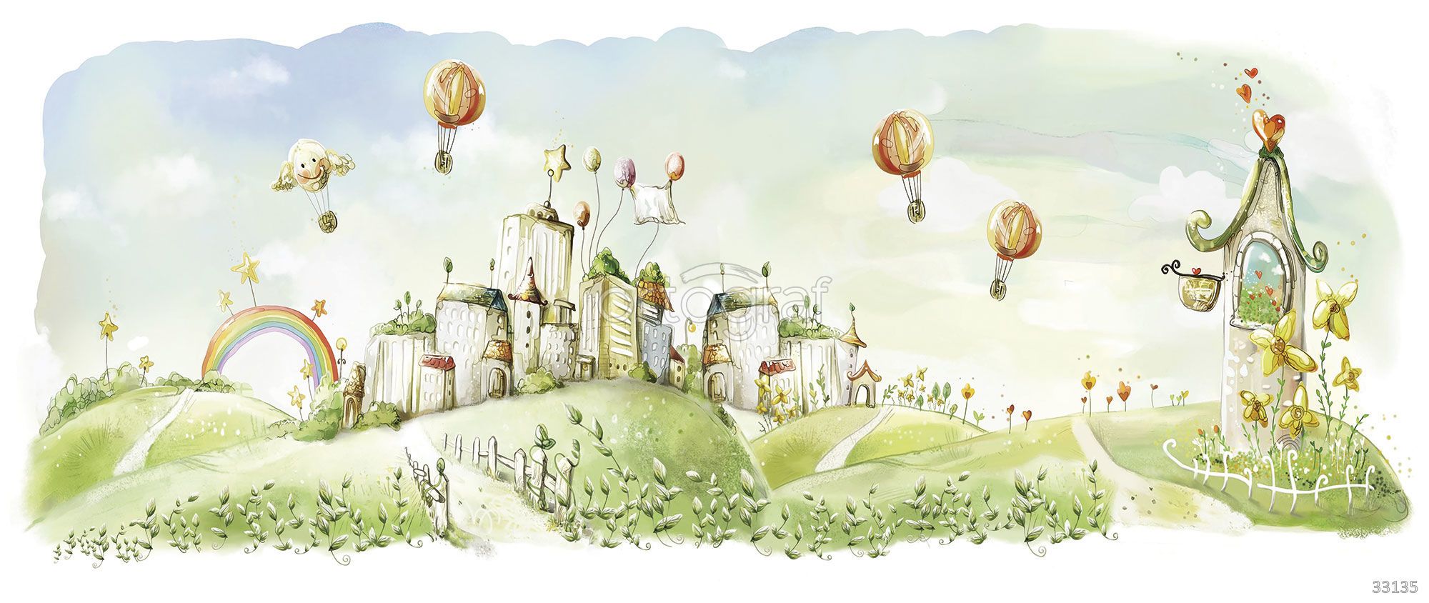 Сказочный городской пейзаж с волшебными домиками на холмах, воздушными шарами и радугой создает атмосферу уюта и фантазии. Иллюстрация наполнена деталями, которые формируют чудесное и позитивное настроение, способствуя развитию воображения. Такой сюжет особенно хорошо подойдет для оформления пространства, где важно создать теплую, игровую и сказочную обстановку.