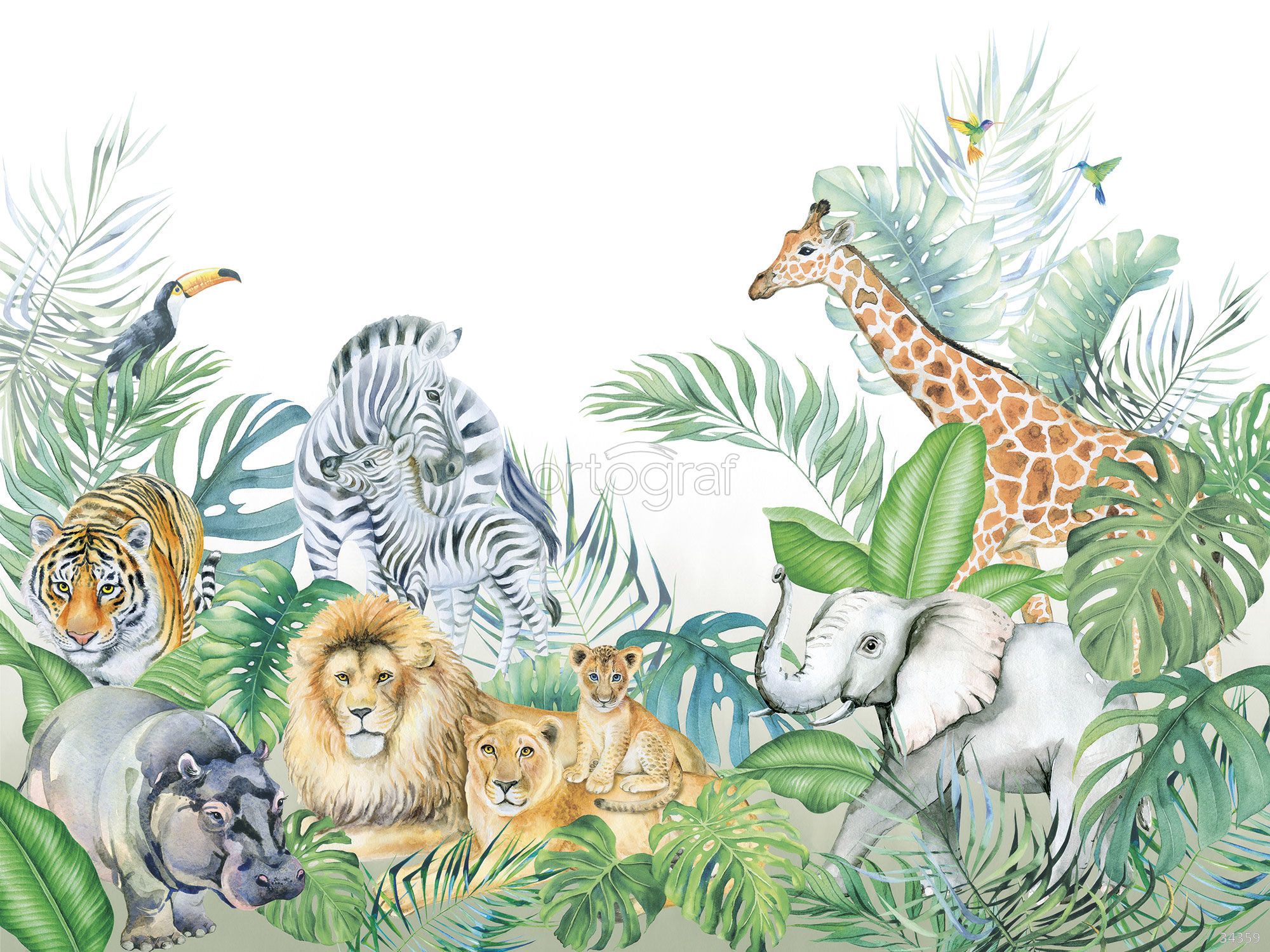 На изображении представлен яркий сюжет с животными саванны и тропического леса среди обилия крупных листьев и зелени. Здесь изображены тигр, лев с львёнком, бегемот, зебра с жеребёнком, жираф, слон, тукан и две колибри, создавая атмосферу настоящего приключения в мире дикой природы. Такой рисунок вдохновляет на изучение животных и отлично подойдет для оформления пространства, где важны воображение и любознательность.
