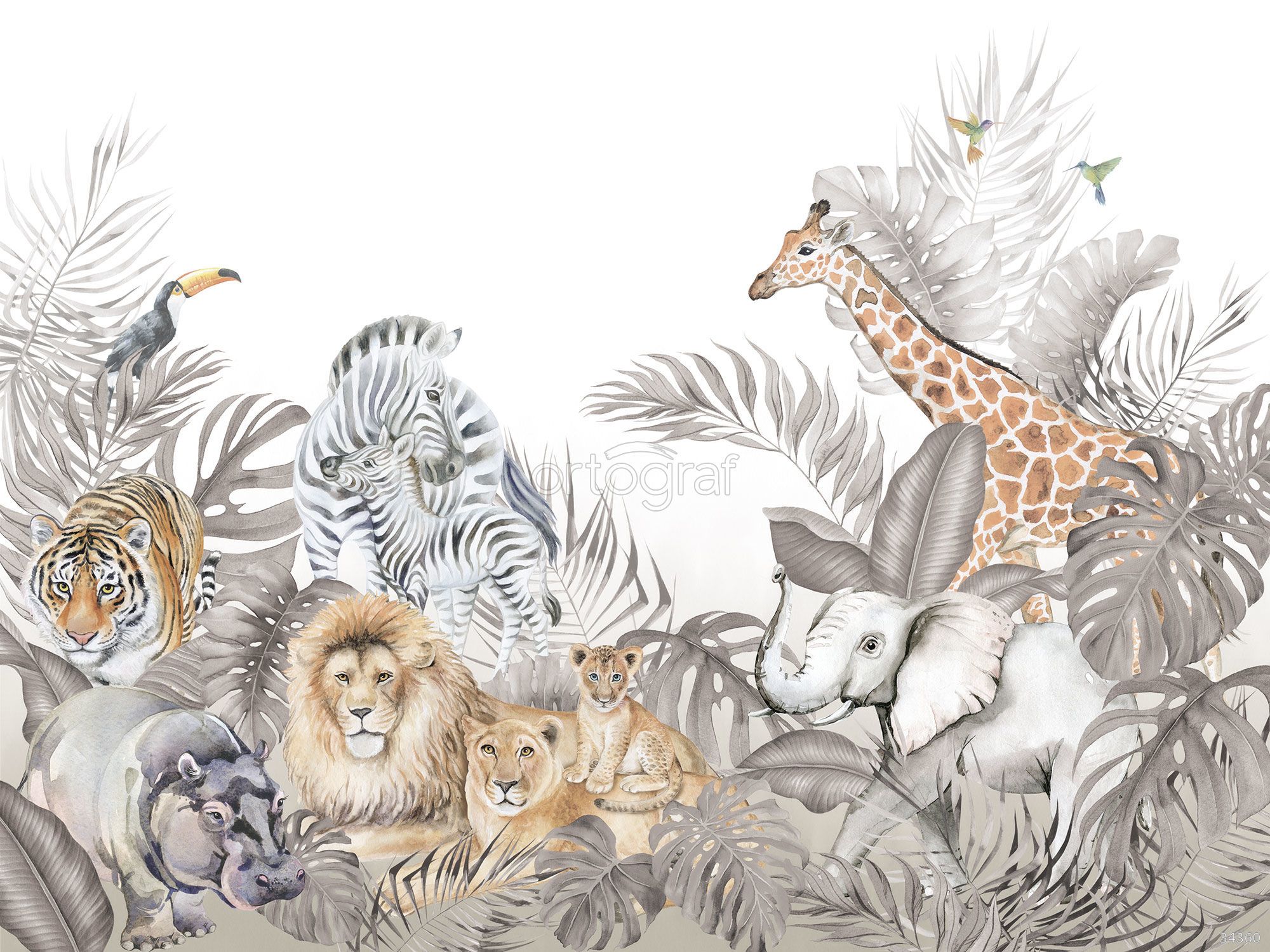 На изображении представлен яркий сюжет с животными саванны и тропического леса среди обилия крупных листьев и зелени. Здесь изображены тигр, лев с львёнком, бегемот, зебра с жеребёнком, жираф, слон, тукан и две колибри, создавая атмосферу настоящего приключения в мире дикой природы. Такой рисунок вдохновляет на изучение животных и отлично подойдет для оформления пространства, где важны воображение и любознательность.