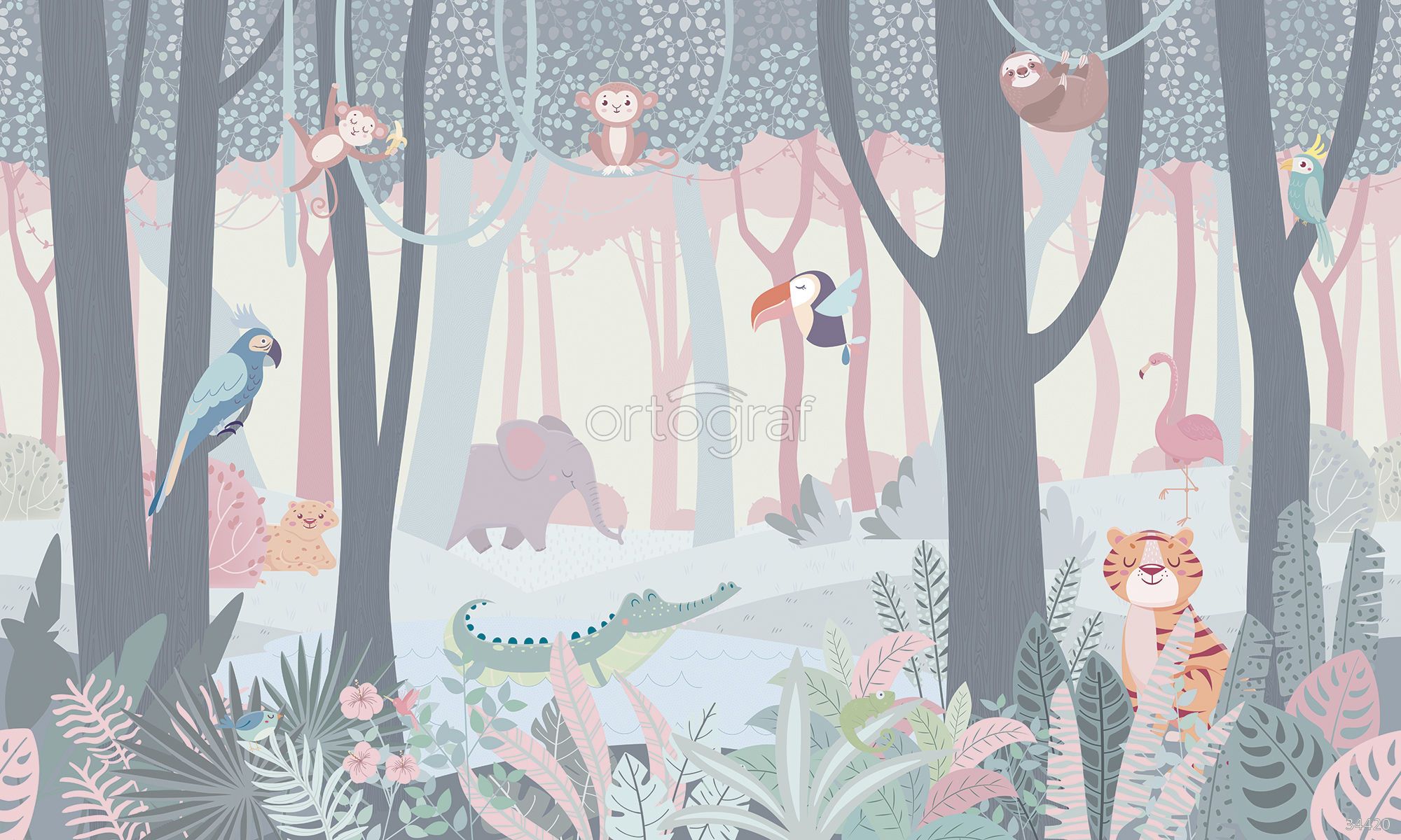 На изображении показан тропический лес с экзотическими животными: обезьянами, тигром, ягуаром, слоном, крокодилом, туканом, попугаями, фламинго, ленивцем и птицами среди листвы. Иллюстрация наполнена атмосферой приключений, дикой природы и открытий, отлично подойдёт для оформления пространства с акцентом на любознательность и воображение. Такой сюжет хорош для интерьеров, где ценят яркость и динамику.