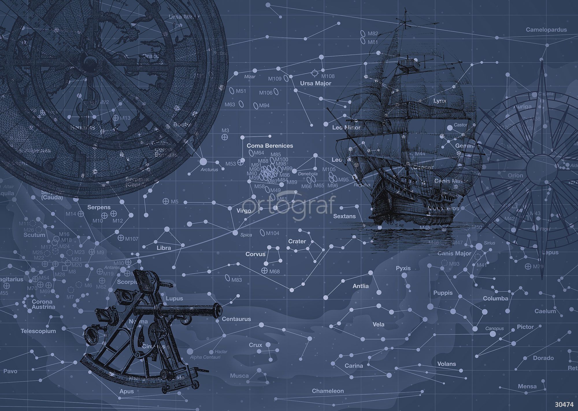 На фоне звёздной карты изображены старинный парусник, астролябия, секстант и роза ветров, что создает атмосферу эпохи великих географических открытий и морских путешествий. Такой дизайн идеально подойдет для кабинета, библиотеки, комнат мальчика или тематической гостиной — везде, где ценится дух приключений и исследовательский интерес.