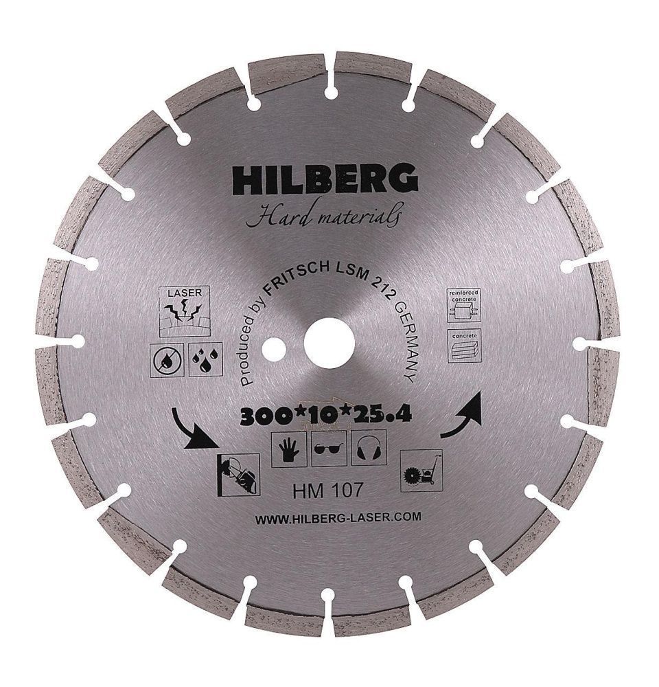 Диск алмазный Hilberg Hard Materials Лазер 300*10*25.4/12 mm Hilberg серия Hard Materials Laser Назначение: армированный бетон, железобетон, твердый бетон, бетон, огнеупоры, гранит. Особенности: все диски данной серии произведены на немецком оборудовании Dr. Fritsch методом лазерной наварки сегментов. Подтверждены сертификатом соответствия системы менеджмента качества требованиям ISO 9000, а также многочисленными дипломами и благодарственными письмами. Технология производства: Лазерная наварка