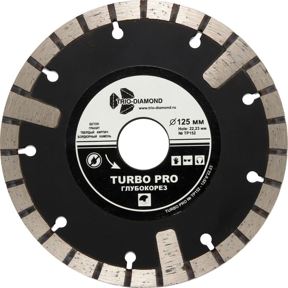 Диск алмазный TRIO-DIAMOND, Turbo Глубокорез 125*10*22.23 mm Турбо Глубокорез серия Pro Назначение: твердый бетон, бетон, огнеупоры, твердый кирпич, бордюрный камень, гранит. Особенности: диски с рифленой кромкой, компенсационными отверстиями и дополнительными защитными секторами от бокового износа. Эти особенности конструкции позволяют добиться высокой производительности, увеличивают ресурс и стойкость, даже при работе с максимально твердым и плотными материалами. Технология производства: Холодное прессование