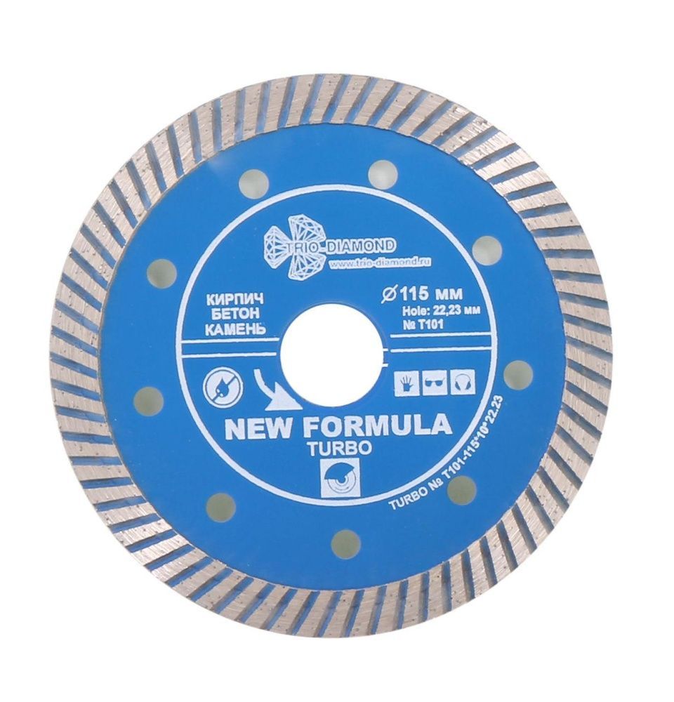 Диск алмазный TRIO-DIAMOND, Турбо New Formula 115*10*22.23 mm Турбо серия New Formula Назначение: для резки широкого спектра твердых и среднеабразивных материалов: бетона, бордюрного камня, кирпича, тротуарной плитки, твердого песчаника, гранита. Особенности: диски с рифленой кромкой, имеют более чистый и аккуратный по сравнению с сегментными дисками рез. За счет турбированной кромки увеличивается скорость реза, отверстия на теле диска способствуют лучшему охлаждению и продлевают срок службы. Подходят как для сухого, так и для мокрого реза. Технология производства: Холодное прессование