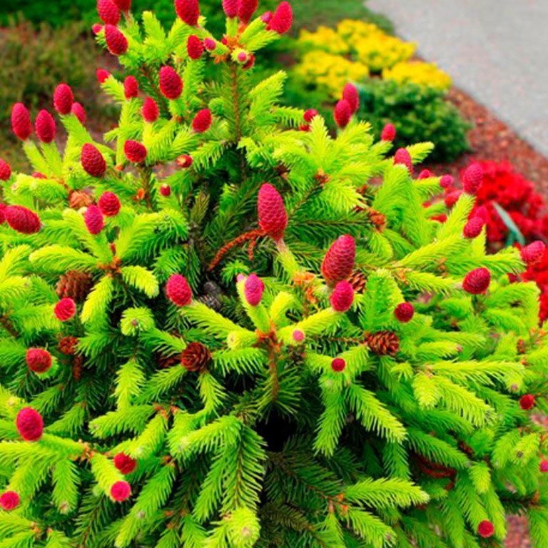 Ель обыкновенная Пуш — оригинальное миниатюрное хвойное растение. Возникло в результате мутации ели Акрокона. Во взрослом состоянии не превышает высоты 1 метра. За счет сочно-зеленой хвои и ярких шишек, цвет которых бывает: розовым, красным, малиновым и фиолетовым, смотрится нарядно и привлекательно. Шишечки у ели Пуш начинают образовываться на 6-9 году жизни. Молодой весенний прирост хвои - нежно-зеленый.