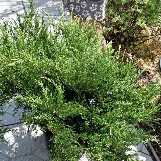 Кустарник быстрорастущий, с ежегодным приростом 15-20 см. К 10 годам растение достигает 1-1,5 м в высоту и 2-3 м в диаметре. Побеги прочные, на краях поникающие, растут под углом 450. Крона плотная, неравномерная. Хвоя мягкая, чешуйчатая, у основания формируются короткие, острые иголочки. Окрас ярко-зеленый или изумрудно-зеленый, к зиме не меняется. Присутствует характерный можжевелово-мятный аромат. Плоды – округлые, сине-черные шишкоягоды, покрытые плотным восковым налетом, диаметром 0,5-0,8 см, ядовиты.
