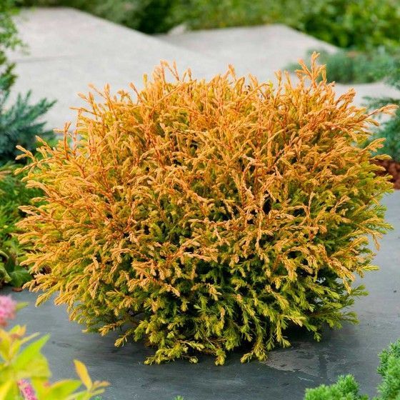 В ландшафтном дизайне хорошо смотрится в контрастных по цвету композициях с другими карликовыми туями.