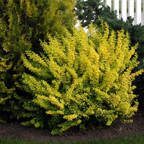 Барбарис Тунберга Ауреа - декоративность высокая, идеально подходит для формирования живой изгороди, высота 0,8 м и ширина 1,0 м, рост медленный, форма сферическая. Окраска листьев на солнце лимонно-желтая, осенью желтовато-оранжевая. Зацветает в мае небольшими снаружи красными, внутри желтыми цветками, ягоды алые.Этот прекрасный, неприхотливый кустарник найдет применение в любом саду. Он хорош в групповых и смешанных посадках, в составе живых изгородей и каменистых садов. Их можно высаживать и на берегу водоемов. Уместны они на парадных местах и в пейзажных композициях. Если растения посажены через 40-50 см, то со временем получается низкая превосходная живая изгородь. Хороши как акценты в карликовых композициях и составляющие элементы в более крупных.