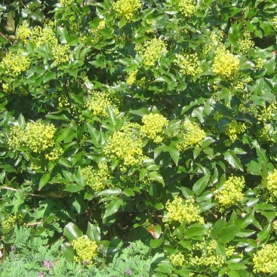 Магония – вечнозеленый кустарник из семейства барбарисовых. Магония ценится за плотные блестящие листья, душистые кисти желтых цветов и съедобные темно-фиолетовые ягоды
