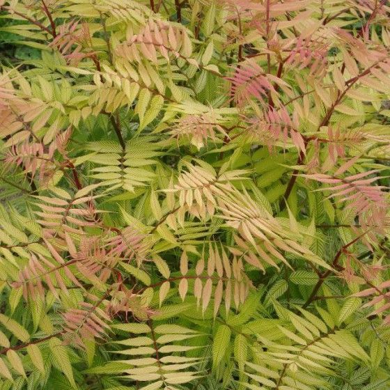 Рябинник рябинолистный Сэм - невысокий кустарник с раскидистой кроной. Листья по форме напоминают рябиновые, за что вид и получил свое название. При распускании листовые пластинки розово-оранжевые, позже цвет меняется с коричнево-красного до желто- зелёного. Цветки мелкие, белые, собраны в пирамидальные метелки до 25 см. Ежегодный прирост 10 см