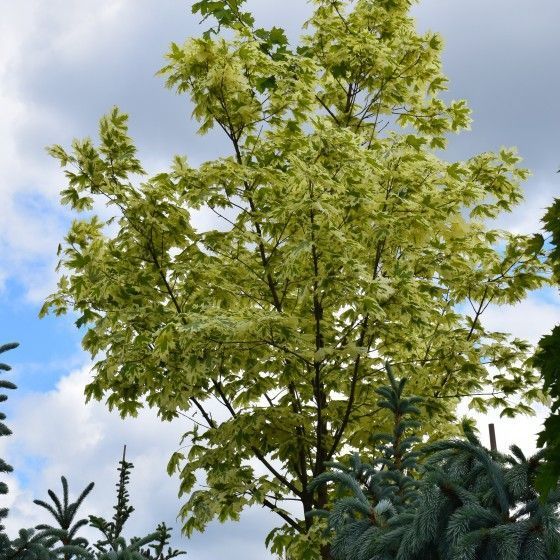 Несмотря на умеренный рост, 30 см в высоту и 20 см в ширину, взрослые деревья достигают высоты 10-15 м, с шириной плотной, пирамидальной, шарообразной кроны, 5-7 м. Ствол покрыт черно-коричнево-серой корой с продольными трещинками. Ветви серо-коричневые, густооблиственные. Листы пяти или семилопастные, черешковые, супротивные. При распускании нежно-розовые, к лету центральная часть становиться зеленой, оставляя по краю широкую бело-кремовую кайму. К осени листва желтеет. Непродолжительное цветение начинается в апреле – мае, когда распускаются небольшие, плоские, ароматные цветы, желто-зеленого цвета. Плоды – двукрылки к осени приобретают буро-желтый оттенок.