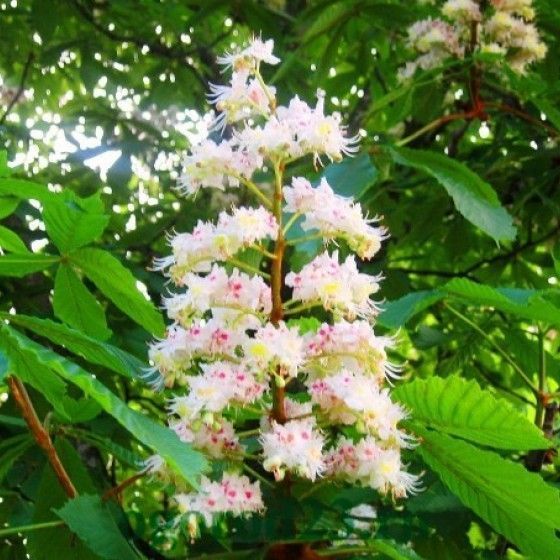 Конский каштан листопадное дерево или кустарник. Дерево в естественных условиях, может достигать и до 25 метров в высоту и до 15 метров в ширину. Листья крупные, сложные 5-7 пальчатые, образуют пышную и густую крону. Цветки белые с желто-красным крапом в свечеобразных, крупных соцветиях