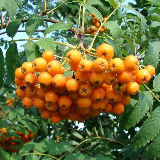 Саженцы Рябины невежинская Жёлтая – это не только красивый сорт, но ещё и полезный. Ведь плоды съедобны и вкусные. Этот вид был выведен в России, а значит, хорошо чувствует себя в холодном климате.