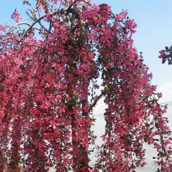 Роял Бьюти-невысокое декоративное растение, тонкие изогнутые ветви образуют плакучую крону, спускаясь до земли.Весной дерево расцветает множеством некрупных темно-розовых цветков. Осенью появляются обильные багрово-красные мелкие плоды.