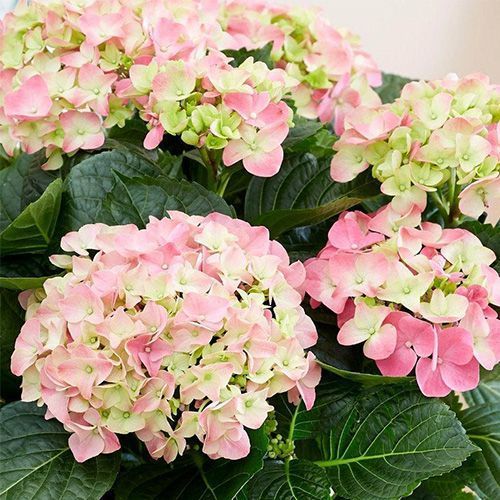 Соцветия крупные. Цветы меняют окраску по мере цветения от фисташково-розового биколора на розово-белый и темно-розовый в конце цветения.