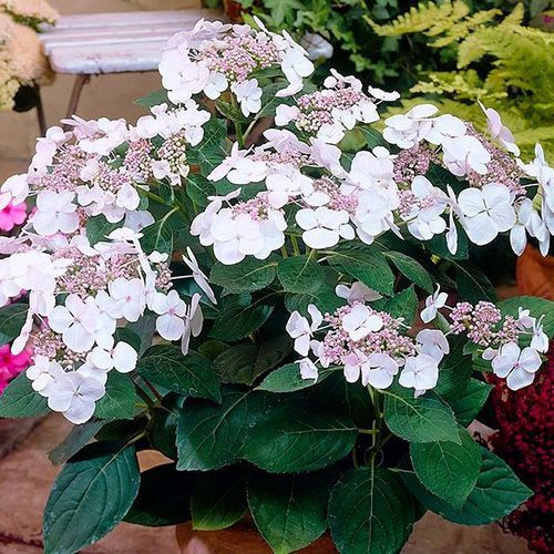 Один из лучших белых сортов с плоскими кружевными соцветиями. Многочисленные стерильные чисто-белые цветки окружают и перемежаются с плодущими голубыми, сиреневатыми и розоватыми цветками. Соцветия диаметром 15-20 см. Цветение длительное, в июле-сентябре. Куст прямостоячий, к 10-ти годам высотой 100 см и шириной 150 см. При выращивании в контейнере имеет высоту 50 – 70 см. Листва глянцевая зелёная. Сорт хорошо смотрится в одиночной посадке, но особенно красив, когда используется в сочетании с гортензиями контрастных цветов.