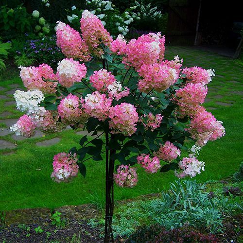 Гортензия метельчатая Vanille Fraise (корнесобственный саженец на штамбе) - один из красивейших сортов гортензии, имеющий огромную популярность в Европе. Он отмечен международными наградами за декоративное переходное сочетание оттенков от белого до глубоко розового, которое можно наблюдать на кусте одновременно. Кустарник с редко разветвленными, прямыми жёсткими побегами, которые сгибаясь под тяжестью цветков придают ему шарообразную форму Высота до 1,5 – 2 м. Данный сорт характеризуется уникальной необыкновенной окраской цветов, которая может быть на одном кусте как белой, так и ярко-красной одновременно. Примечательно, что в начале цветения гортензия усыпана белыми цветами. Затем розовеют и становятся похожи на «клубничное мороженое», окраска может меняться в зависимости от типа почвы и климата. Цветки в длинных широкопирамидальных метелках до 25 см длиной. Цветет продолжительно — с июня до октября.