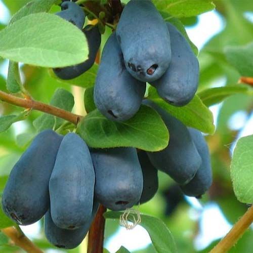 Плод – сине-сизая продолговатая ягода, весом около 1 г, с чашечкой на внешнем крае. Урожай созревает неравномерно, но спелые плоды не опадают. Кусты практически самобесплодные, поэтому жимолость принято высаживать по несколько штук в группах. Для групповых посадок используют разные сорта.