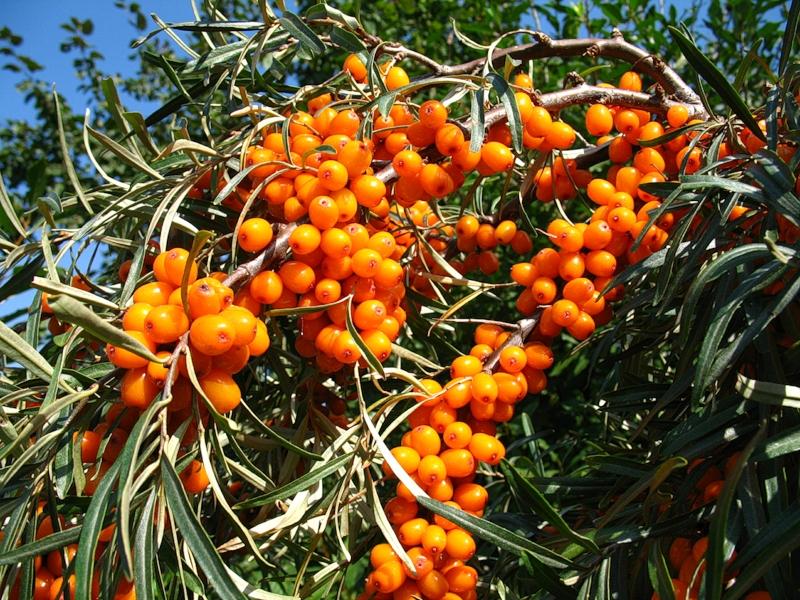 Поскольку облепиха двудомна, опыление для нее обязательно, если планируется снять урожай. Поэтому весной, в период цветения, если стоит безветренная погода, надо срезать цветущую веточку с мужского растения и потрясти ее над кроной женского. В плодах облепихи содержатся сахара, органические кислоты, эфирные масла, каротин, витамины С, Е и К.