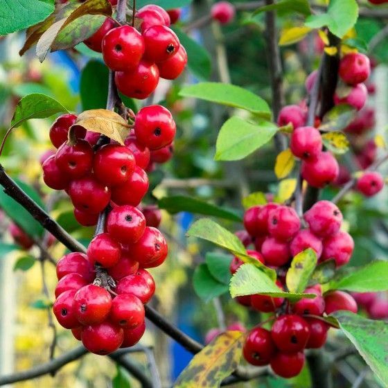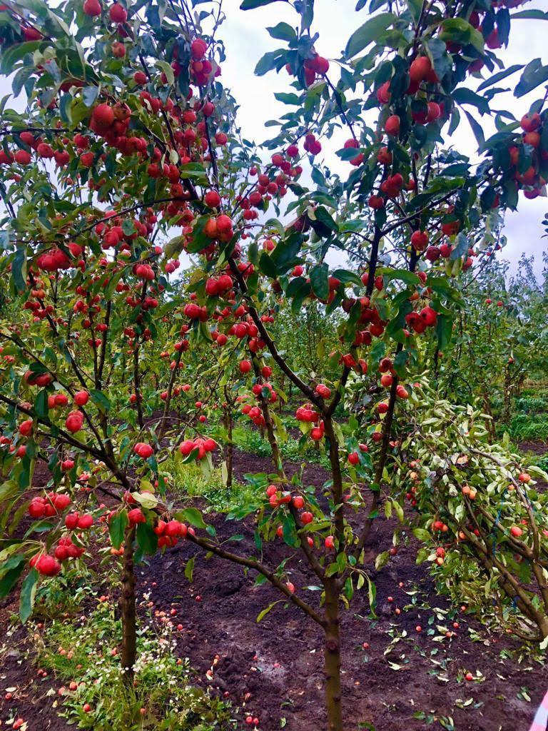 Плоды миниатюрные, смотрятся декоративно, свисают гроздьями с ветвей. В зависимости от сорта яблочки бывают желтыми, красными, зелеными с румяными бочками, белыми.