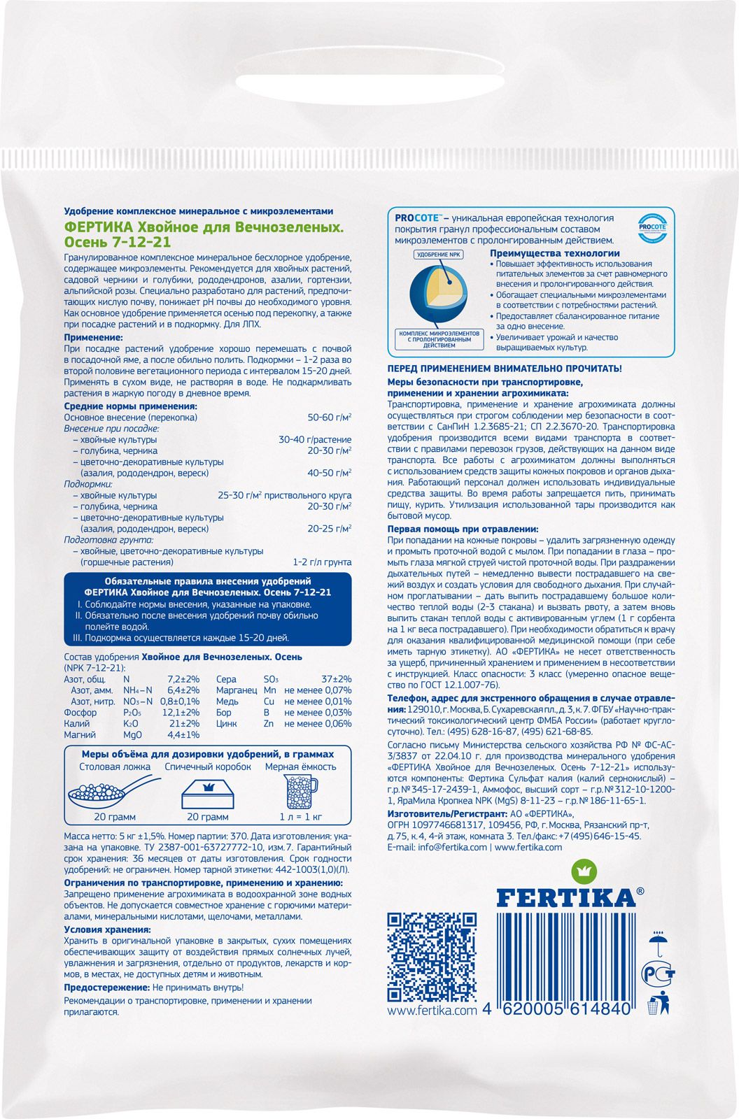 Удобрение Фертика Хвойное Осень рекомендуется вносить в почву в осенний период, когда растения готовятся к зимовке. Для достижения наилучших результатов, следует равномерно распределить удобрение по поверхности почвы вокруг корней и аккуратно заделать в верхний слой. Рекомендуемая норма внесения составляет 50-100 г на 1 м², в зависимости от возраста и состояния растения. Обязательно полейте растения после внесения удобрения для лучшего усвоения питательных веществ.