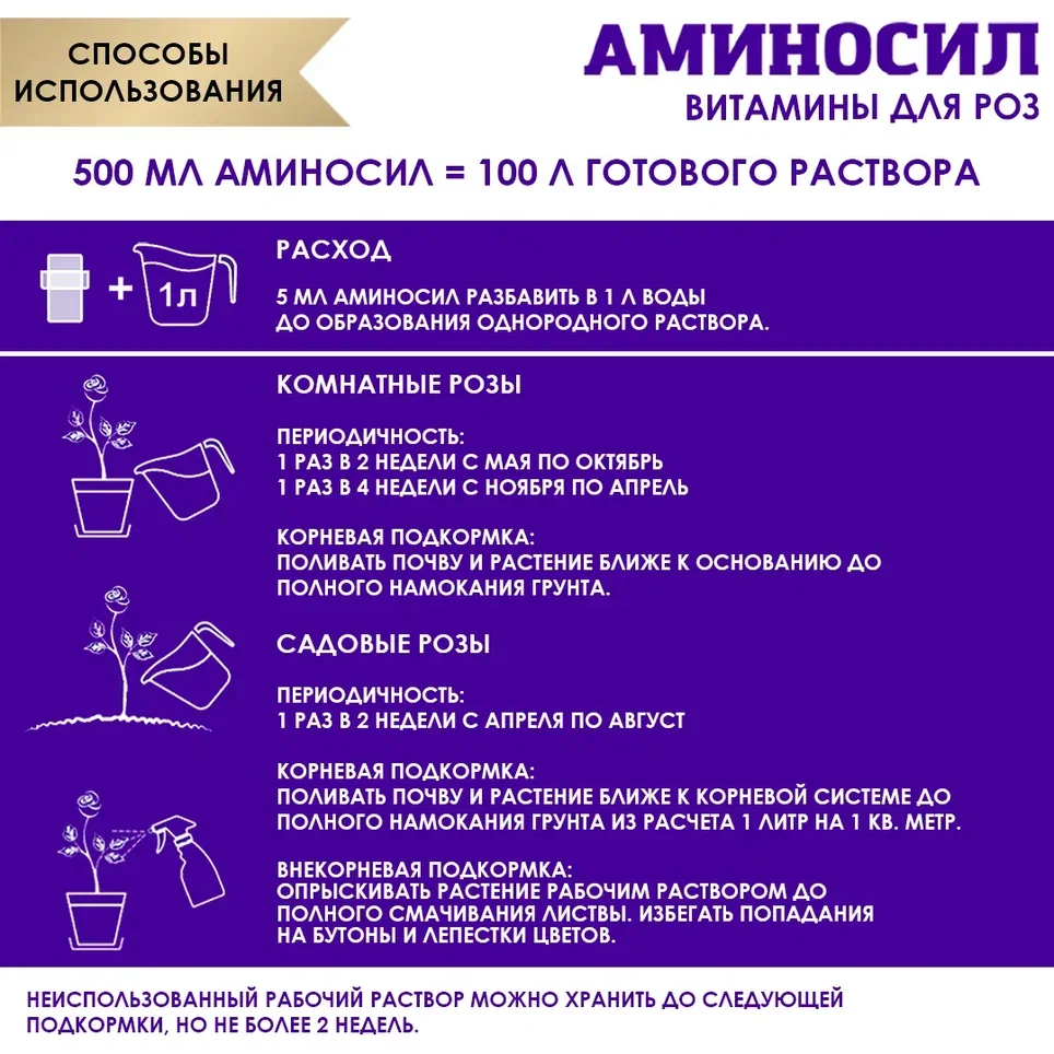 Не упустите возможность сделать ваши розы поистине великолепными! Концентрат "Аминосил для роз" – это ваш надежный помощник в садоводстве. С его помощью вы сможете добиться потрясающих результатов и наслаждаться красотой цветущих растений на протяжении всего сезона. Позаботьтесь о своих розах, и они ответят вам щедрым цветением и здоровьем!