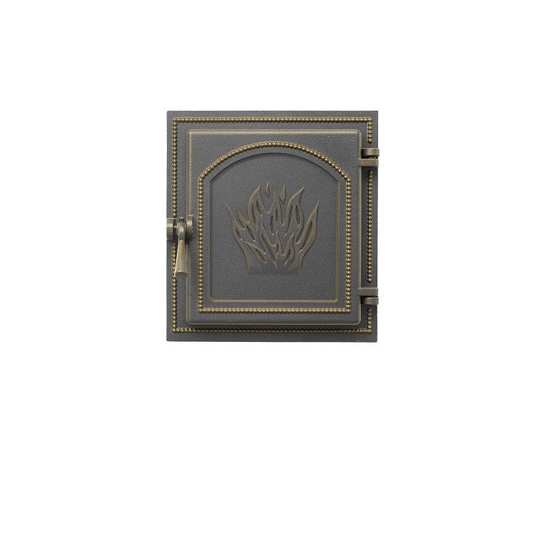 Для изготовления топочной дверцы могут использоваться разные материалы. Эта модель произведена из чугуна, который считается идеальным выбором, ведь он обладает высокой теплопроводностью, устойчивостью к коррозии и механическим повреждениям. И при этом дверца не выглядит скучной – а все благодаря рельефному рисунку и использованию для его выделения благородного бронзового оттенка. Для дверцы не предусмотрено прозрачной вставки из жаропрочного стекла, но это как раз тот случай, когда сплошное полотно смотрится даже лучше. Не говоря уже о том, что оно позволяет повысить пожарную безопасность и получить дополнительное тепло.